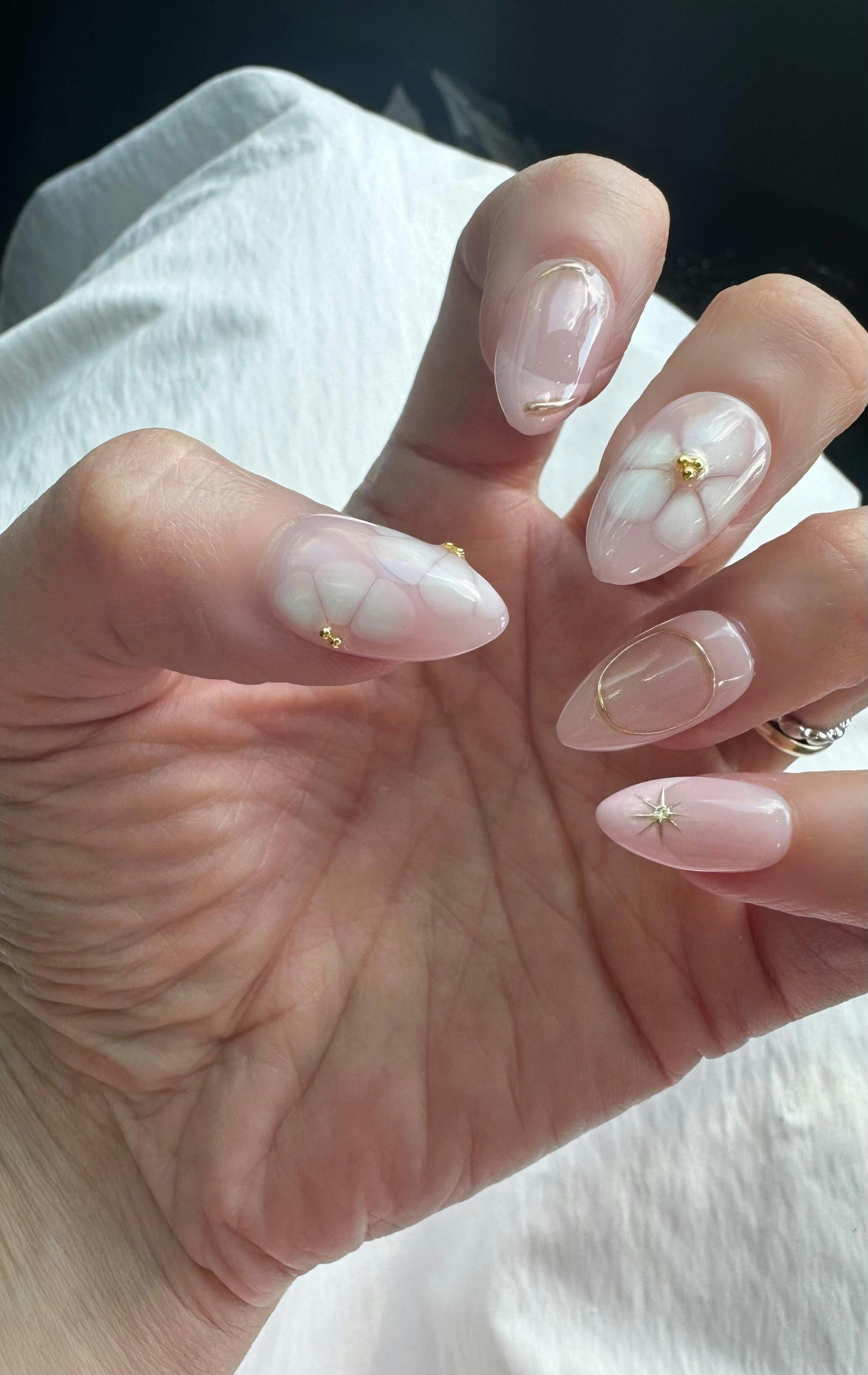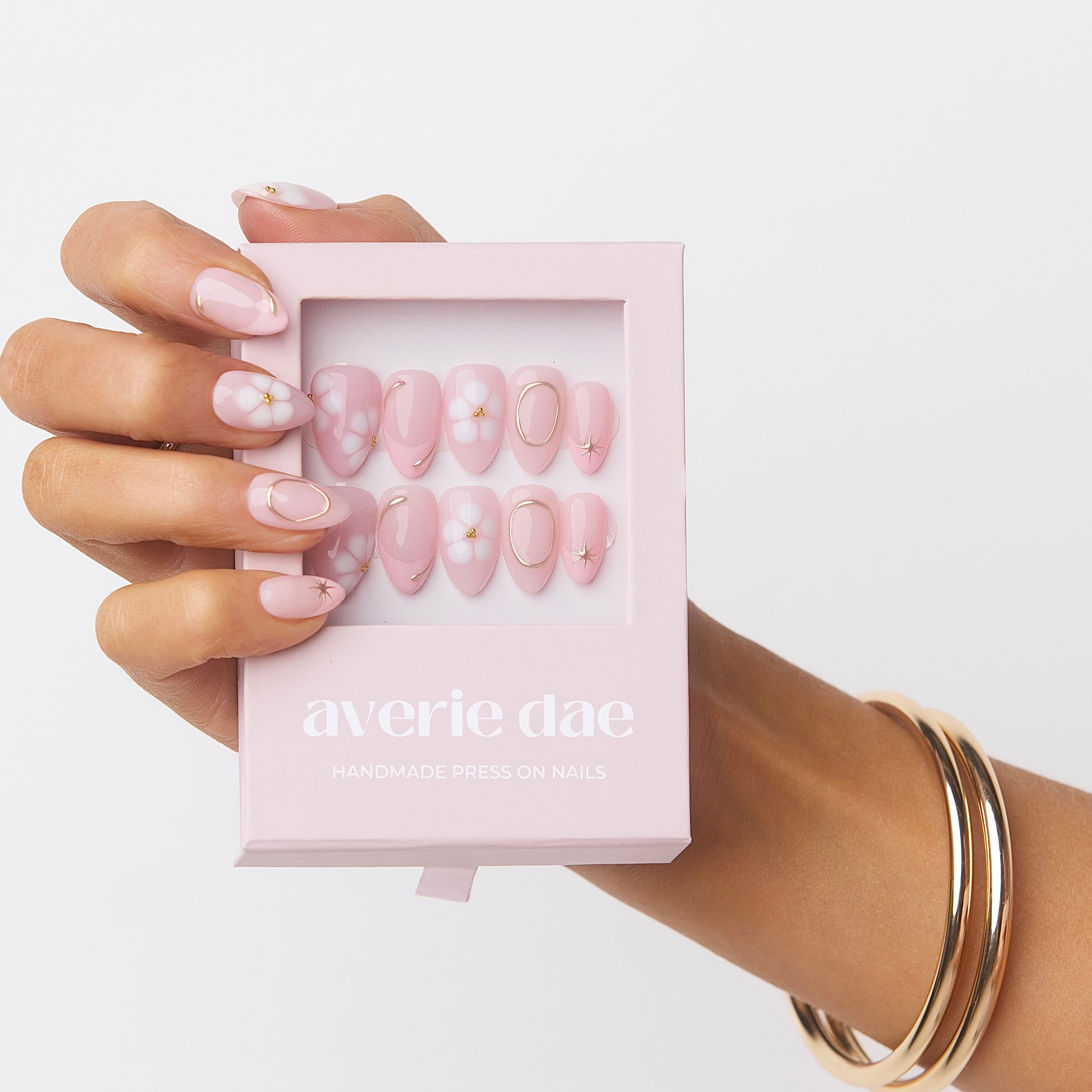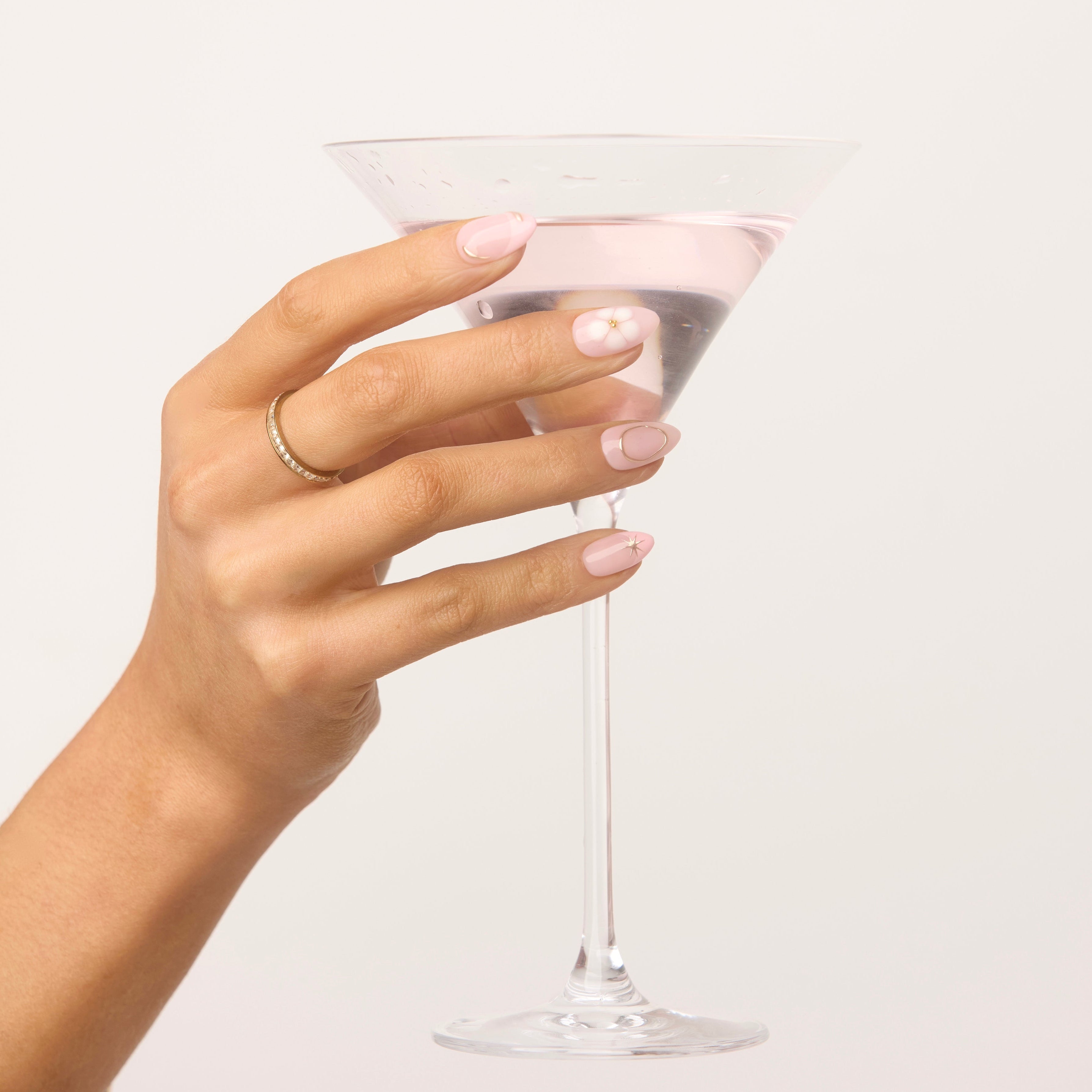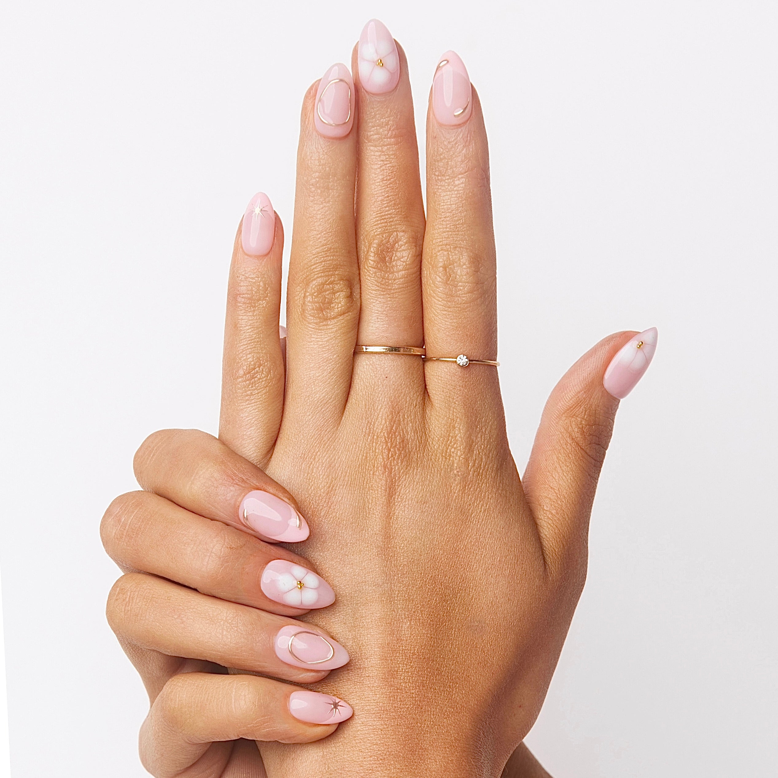 Blush Bloom features a soft blush base with blooming gel florals and 3D gold chrome accents for an elegant and luxurious finish.